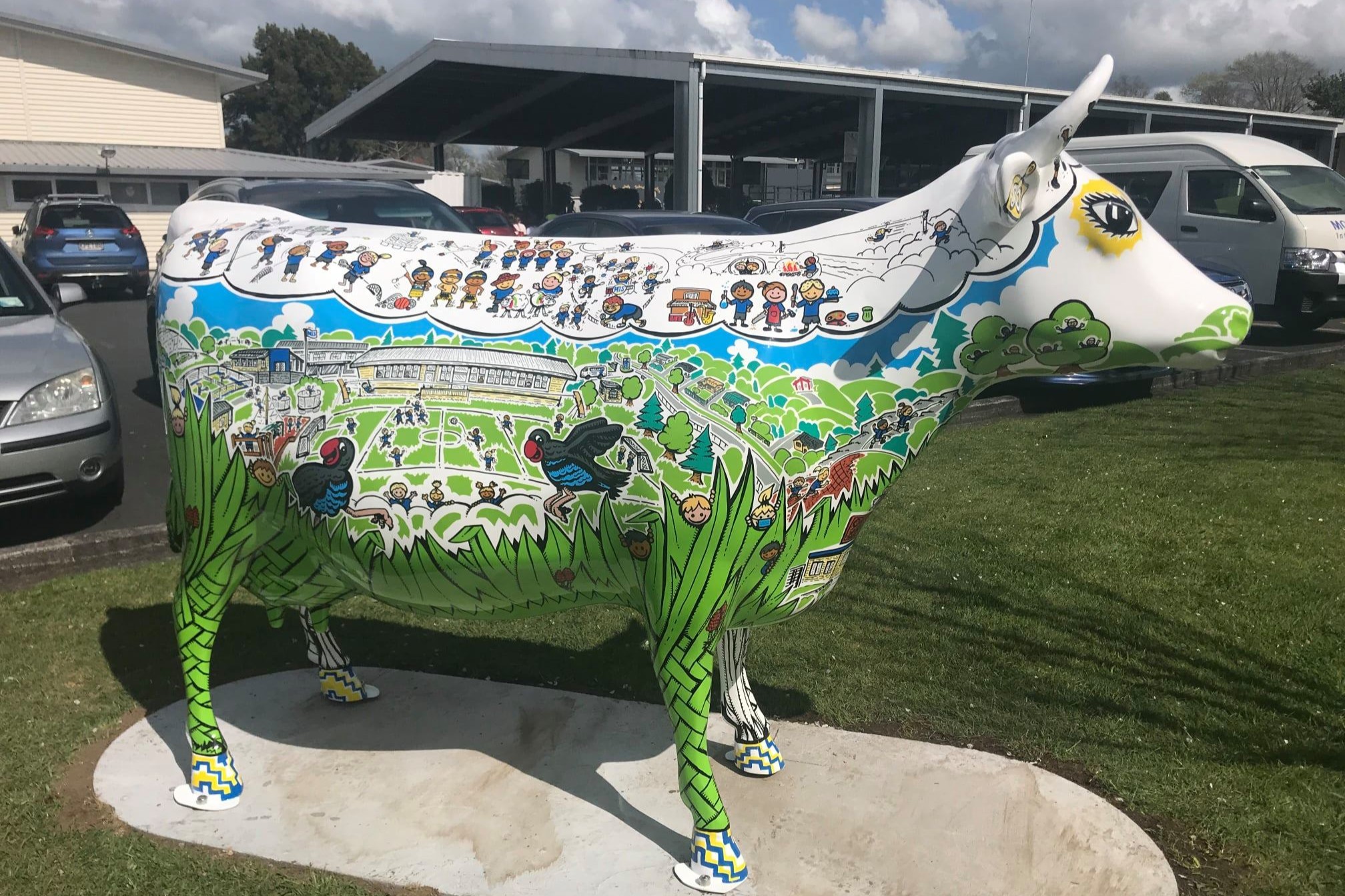 MIS Jubliee is the newest cow to the Morrinsville Herd of Cows, and her story is quite beautiful. CooperAitken co-sponsored MIB Jubillee with Morrinsville Intermediate School to create a piece of art that symbolises 50 years of history of their school. One side of MIS Jubilee is black and white and presents the ‘Then’ and the other side full of colour and detail representing the ‘Now’, beautifully representing the change in the school over their 50 years in existence, amazingly captured by artist Paul Martin.